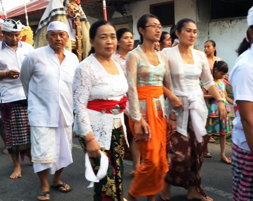 年配の女性たちは通りが見える場所に座っています。「もうそろそろ来る頃かしら?」と通りをきょろきょろと見渡しています。道を少し先に進むと車もバイクも道端に停車。独特のリズムでガムラン音楽を奏でながらたくさんの村人が練り歩いてきました。